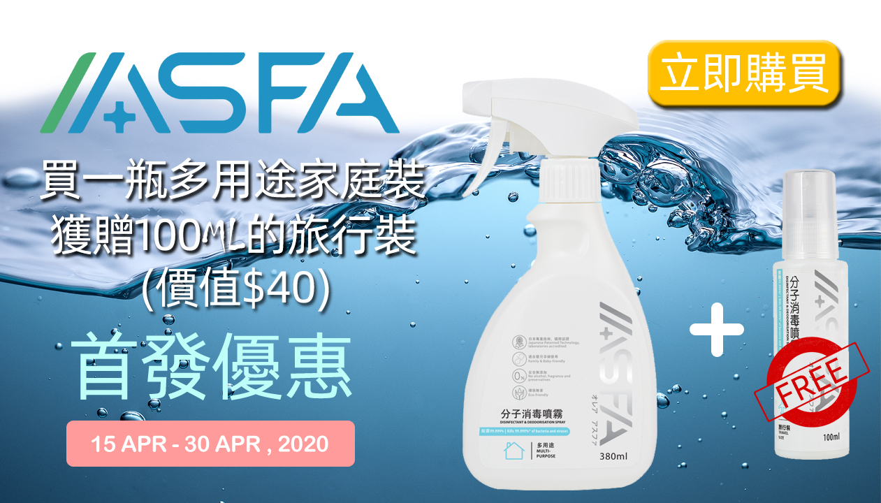 為了慶祝ASFA正式登陸香港,我們推出產品預售優惠,凡於2020年4月15-30日期間在本店購買一瓶380ml多用途家庭裝可以獲贈100ml旅行裝一瓶(價值港幣40元)。
